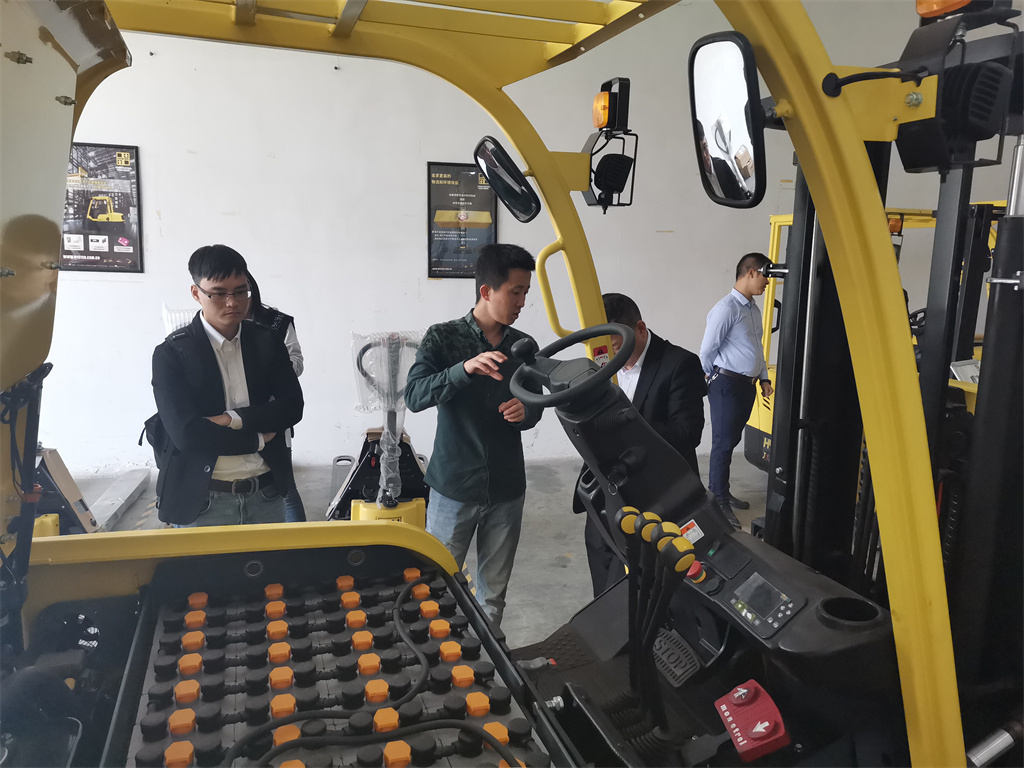 在會議室上完理論課后,大家一起轉移到了東莞惠客隆叉車東莞分公司的展廳開展實踐課。